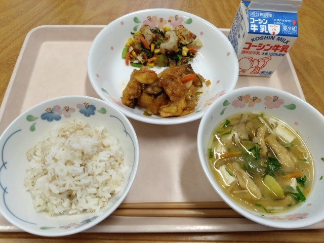 今日の献立は、和食の献立でした。たらと野菜の甘酢あん炒めは、砂糖や醤油、お酢にトマトケチャップを加えた甘酢あんです。揚げたたらと野菜、そしてじゃがいもに味をつけました。そのため、砂糖・醤油・お酢で作る甘酢あんよりまろやかな味になり、子どもたちにとって食べやすいため、人気の味付けです。ですが、今日は出来上がった全体量が多くなってしまったため、いつもより量が多く残ってしまいました。子どもたちからも「おいしかったけど、思ったよりお腹いっぱいになった」という声があったため、次回は全体量を気を付ける必要があると感じました。