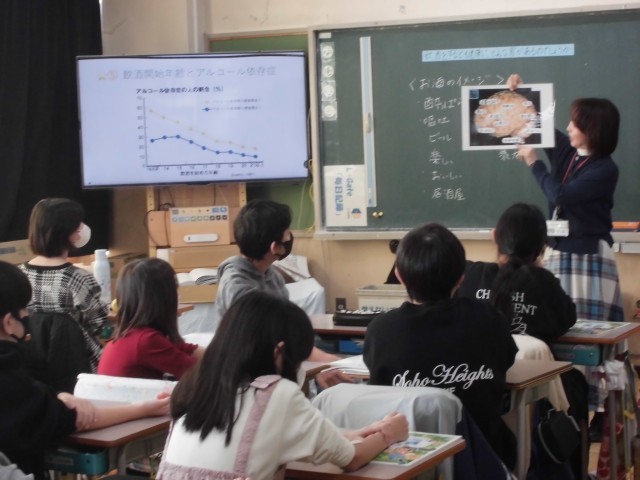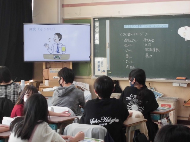 11月27日(木)2校時、保健体育の学習の様子です。今回は担任と養護教諭による授業です。飲酒による体への影響について学習しました。