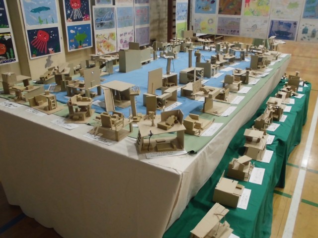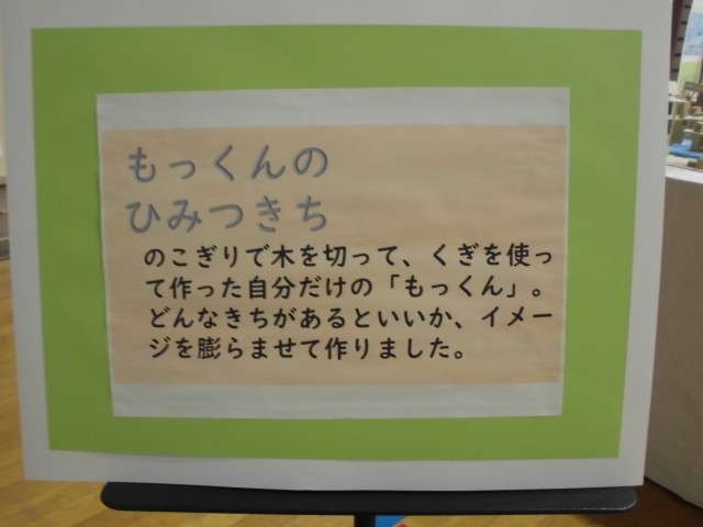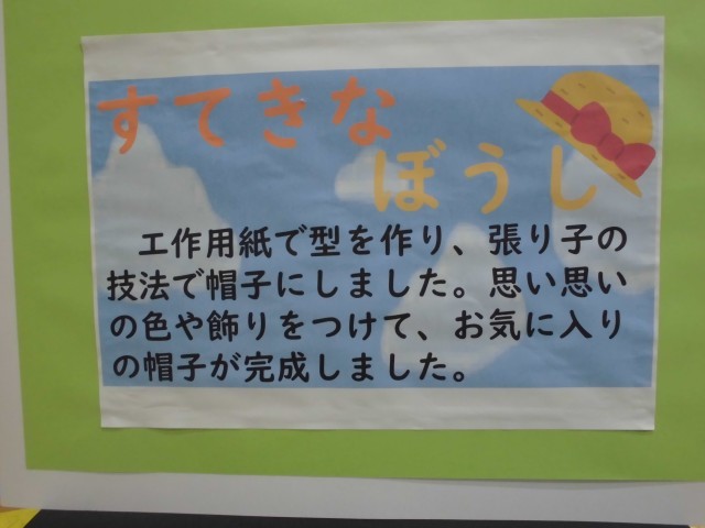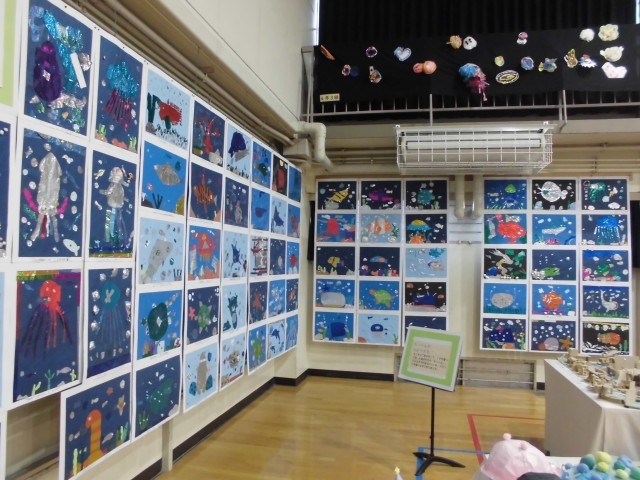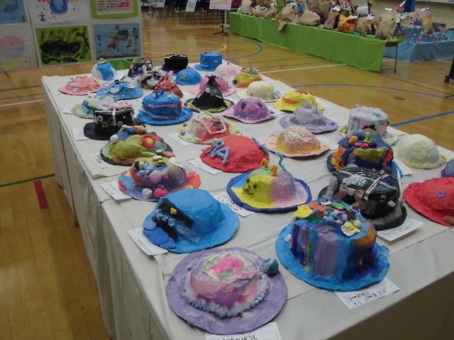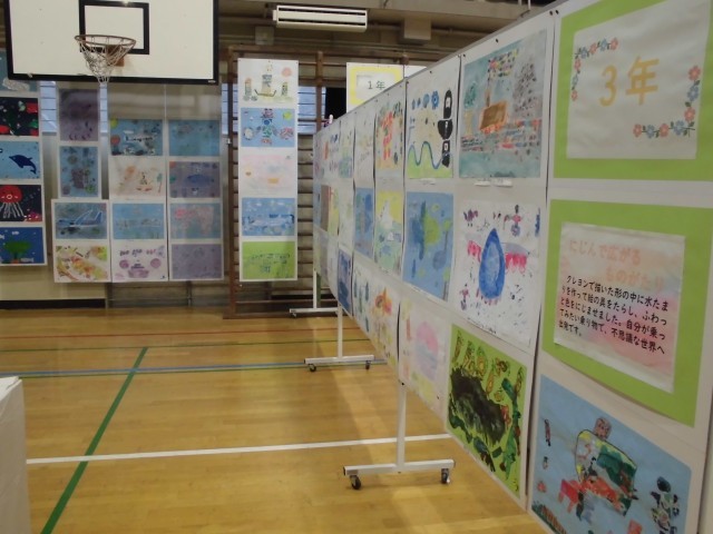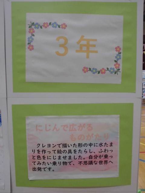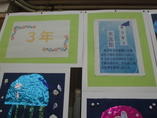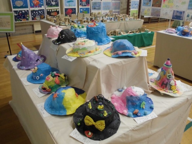 展覧会ブースの紹介です。3年生では、平面作品「きらきら水族館」・「にじんで広がるものがたり」、立体作品「すてきなぼうし」・「もっくんのひみつきち」を展示しました。どの作品も子どもたちの一生懸命に作成した様子がうかがえます!