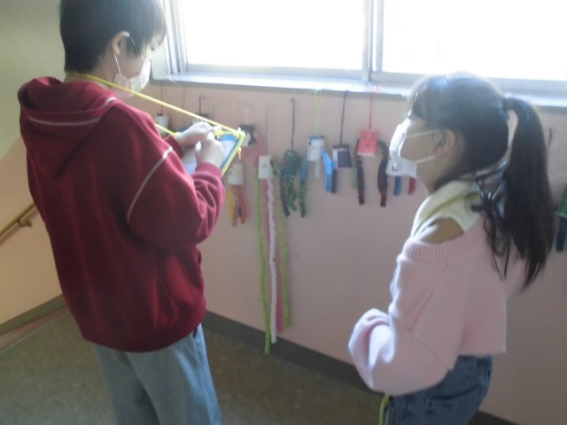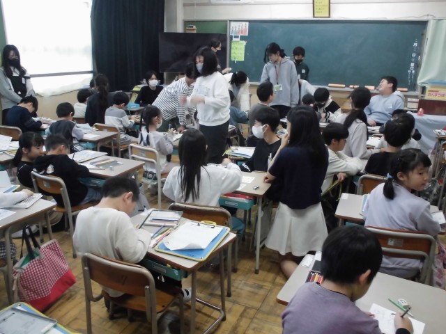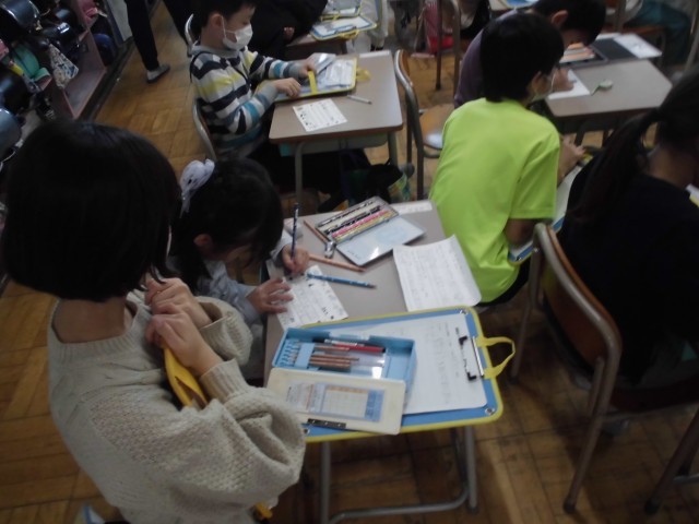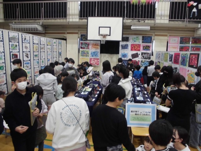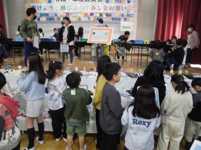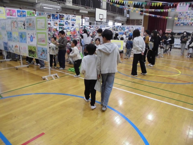 11月28日(金)、展覧会2日目です。今日はペア鑑賞日で、2・4年、1・6年、3・5年の兄弟学級でペアを組み、お互いの作品を紹介しながら鑑賞し合いました。「届けよう! 感じよう! みんなの思い」が今回のテーマですが、お互いの作品のよいところを「よかったねカード」に記入して交換し合い、感じたこと・思ったことが伝え合えました!