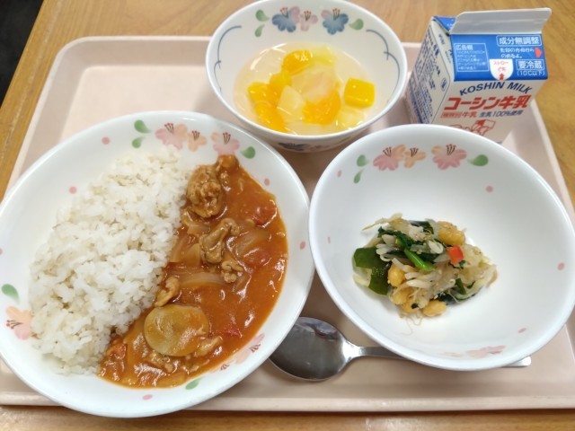 ハッシュドビーフという料理の「ハッシュ」という言葉は、「細切れの」という意味があるそうで、細かく刻んだ野菜と薄切りの牛肉を炒めて、デミグラスソースやトマトソースで煮込んで作られます。今日の給食では牛肉の代わりに豚肉を使ったので「ハッシュドポークライス」として提供しました。給食室としては、公開授業の関係で教室移動も多くあったため、子どもたちの給食の準備が間に合うかの心配をしていましたが、大きな問題もなく準備が始まっていたのを見て安心しました。また、給食時間終了後すぐの下校準備でしたが、ごはんの上にかけて食べる食べやすい献立だったのもあり、おかわりもしっかりして、みんなたくさん食べることができていたようです。