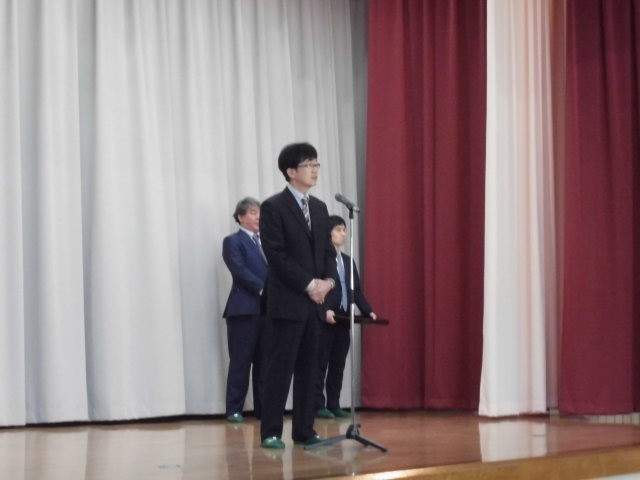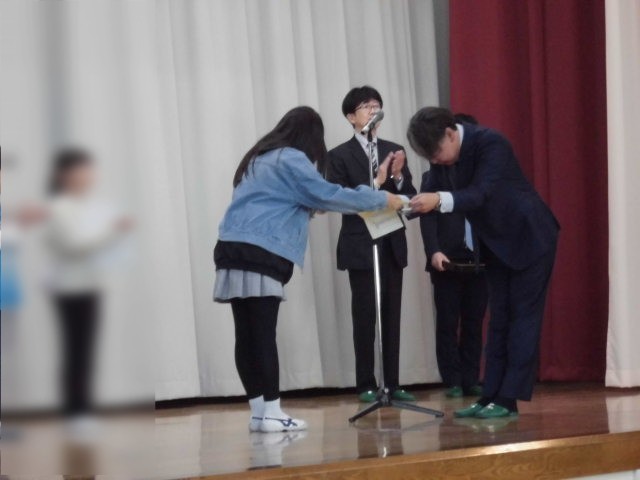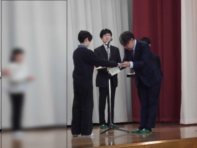 今年最後の朝会は表彰朝会でした。今日は、江戸川区のマラソン大会、書道、税の絵葉書コンクールと6名の児童が、江戸川南税務署から税務署長さんをはじめ7名の税務署の方と全校児童が見守る中、表彰状をいただきました。