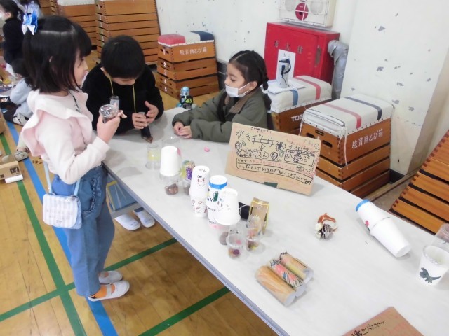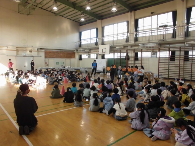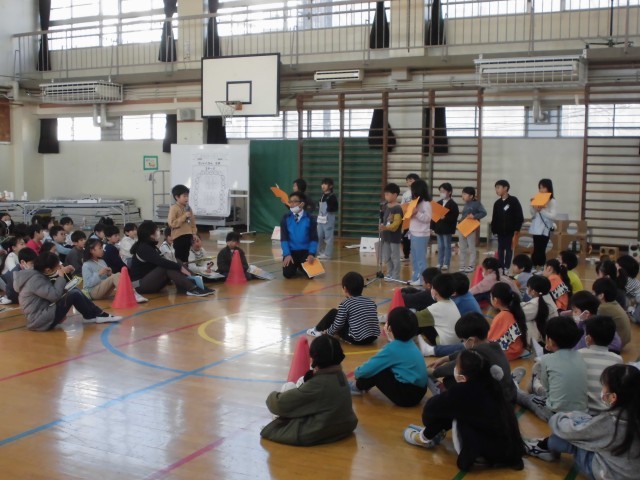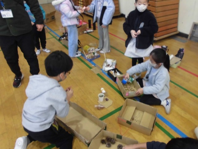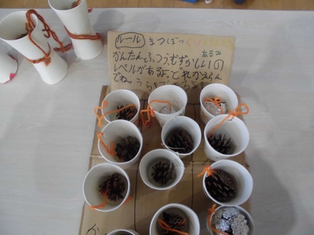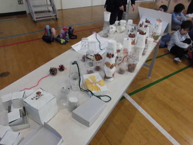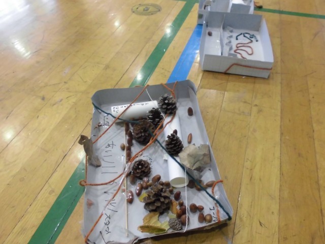 12月16日(火)1~2校時・体育館の様子です。今日は、1年生がこれまでに時間をかけて作成してきた秋の自然を生かした遊び道具で「秋まつり」を行いました。松ぼっくりやどんぐりを使った遊び道具で、ゲストの2年生にたくさん楽しんでもらいました。