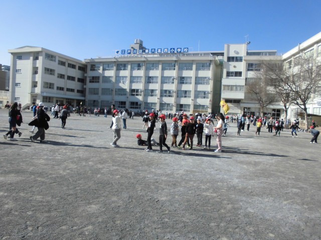 本校の特色の1つでもある「縦割り班活動」。本日は、昼休みを少し長く取り、縦割り班遊び(ロング昼休み)を実施しました。とても暖かい日差しの中、班毎に仲良く元気に遊んでいました。