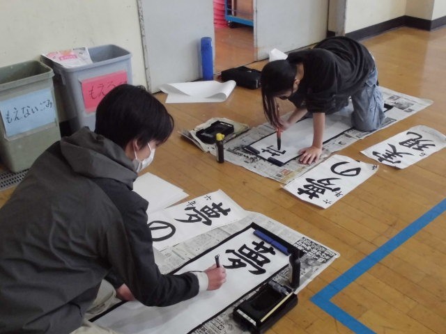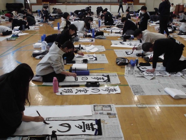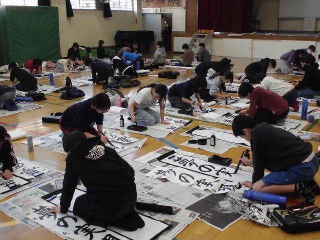 3~6年生は体育館で毛筆を、1・2年生は各教室で硬筆を行います。体育館には箏のBGMが流れ、その音と筆の音だけが静かに響き、文字と向き合う。日本の文化を感じる会になります。