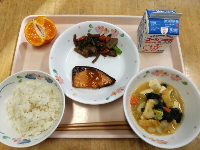 今日の献立は、冬が旬の「ぶり」を使った「ぶりのつけ焼き」でした。ぶりは「天然物」と「養殖物」があり、天然物はさっぱりとした味わいで、身がしっかりしているのが多く、養殖物は脂がのっていて身がやわらかいのが特徴です。今日は焼き物献立だったので、身が固くなりにくい「養殖物」のぶりを業者の方に持ってきてもらいました。身がやわらかく食べやすかったのもあったのか、子どもたちにも大人気で、巡回中にも「魚のおかわりもっと欲しい!」という声が多くありました。