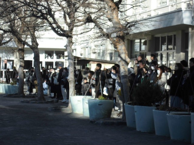 風は無く、練習の成果を発揮するのにふさわしい晴天です。校庭の白梅も香っています。