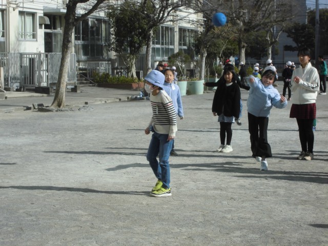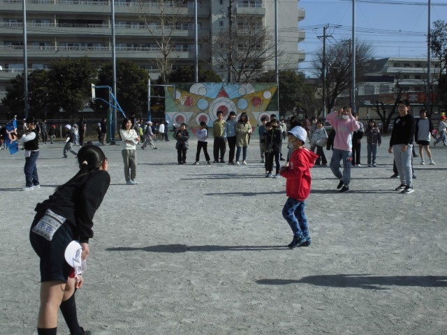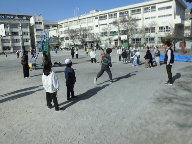 1月26日(月)昼休みの様子です。今日は縦割り班遊び(ロング昼休み)の日です。各縦割り班毎に、1年生から6年生まで一緒に遊べる内容を考えて遊びます。今日は「泥棒と警察」、「ドッジボール」、「だるまさんが転んだ」、「鬼ごっこ」…等、元気よく遊んでいました。