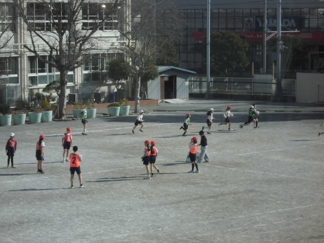 2月5日(木)2校時、体育の授業の様子です。4年生は校庭で「タグラグビー」を行っていました。友達と声をかけ合いながら試合を進め、得点すると「やったー!」と嬉しそうな声が響いていました。