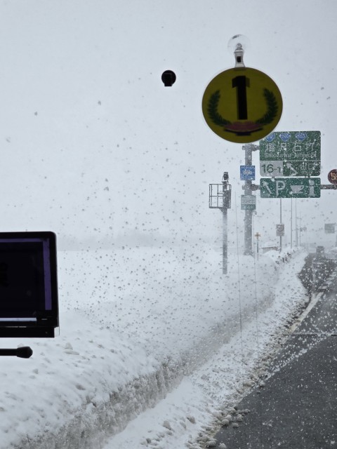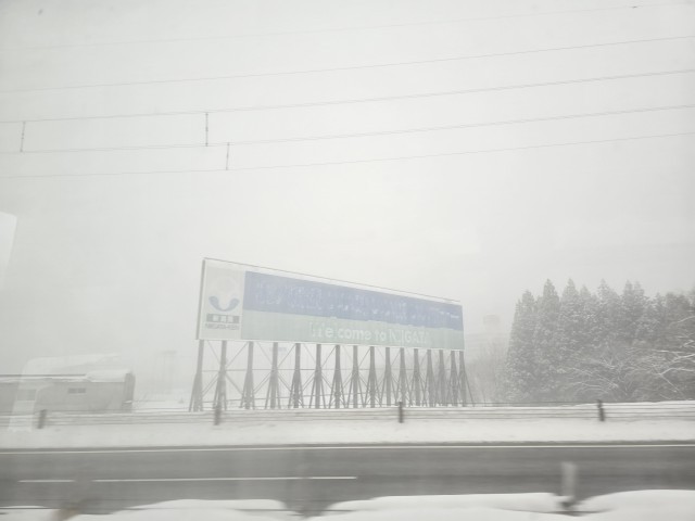 トンネルを抜けるとそこは雪国でした。今は前が見辛くなっています。湯沢の看板を過ぎ、南魚沼市、塩沢の看板が見えてきました。