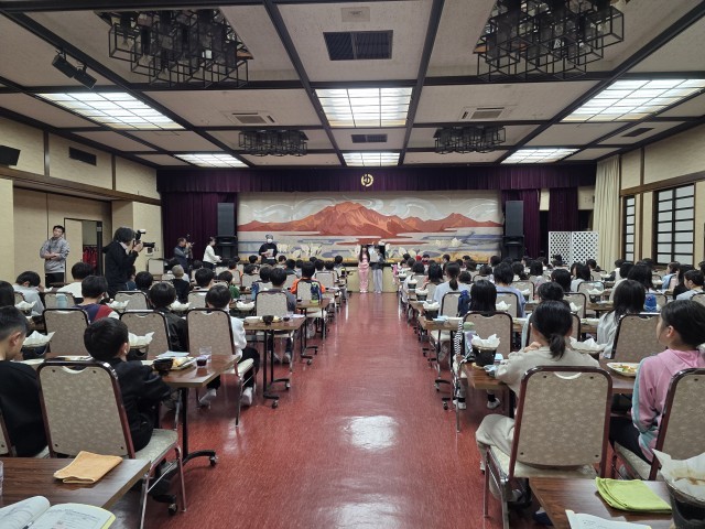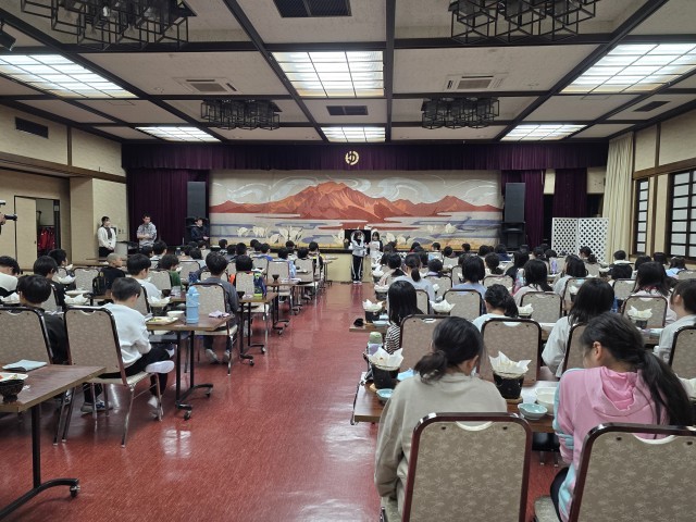 食事係りの児童が、ご飯となめことお豆腐のお味噌汁とお水などを配膳と片付けをします。
