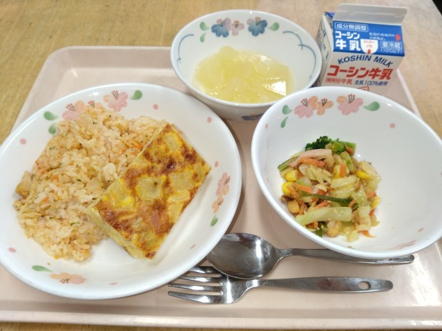 今日は、子どもたちの大好きなオムレツを提供しました。オムレツの中には、ベーコンや玉葱、じゃがいもの他に、チーズが入っています。また、一緒に提供したチキンライスは、トマトケチャップではなくパプリカパウダーを使って赤く色を付けました。中にはケチャップが入っていると思ったようで、ケチャップの味がしないと驚いている子も多かったです。チキンライスの量が少し多めだったので、残食が多くなるのではと心配していましたが、「オムレツとセットだとたくさんごはん食べられるよ!」と言って、たくさん食べてくれる子が多く、各クラスの食缶が軽い状態で給食室に返却されていました。