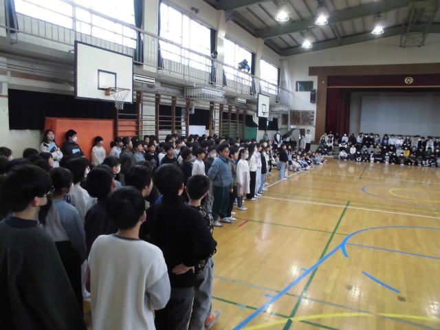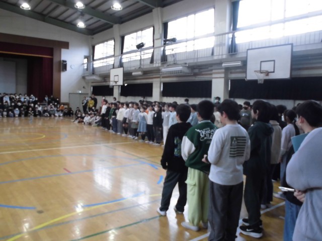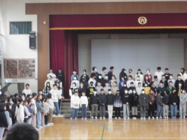 2月16日(月)朝の時間の様子です。今日は体育館で「音楽朝会」を実施しました。今週金曜日に予定されている「6年生を送る会」での全校合唱に向けて、練習をしました。これまで各学級で練習してきましたが、今日は全校での合唱だったので、体育館中にきれいな歌声が響き渡りました。6年生を送る会での全校校合唱が楽しみです!