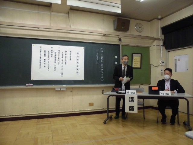 本日の放課後、大学から講師を招いて、今年度の校内研究会の成果と課題を振り返り、次年度に向けて講演をいただきました。「いきいきと学び、表現できる子を目指して~個別最適な学び、協働的な学びを通した授業づくり~」の2年目が終わります。先生たちも、子ども達のいきいきと学ぶ姿、笑顔あふれる学校を目指して、日々研鑽を積んでいます。