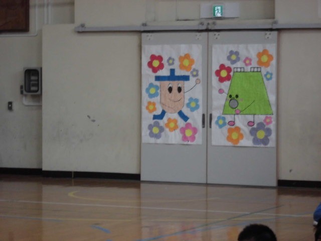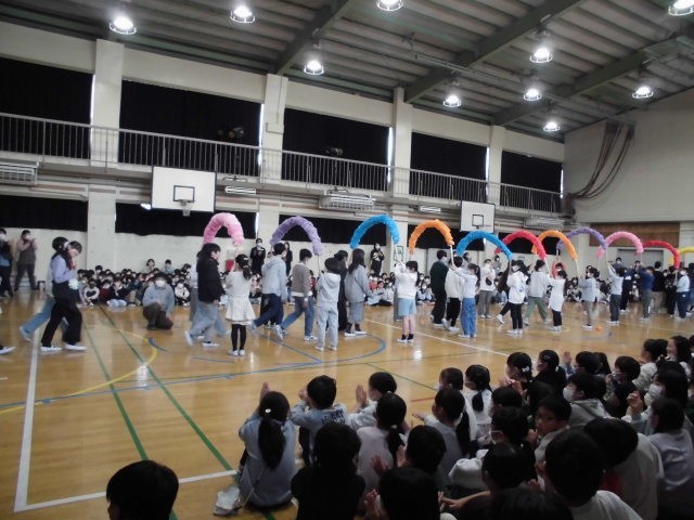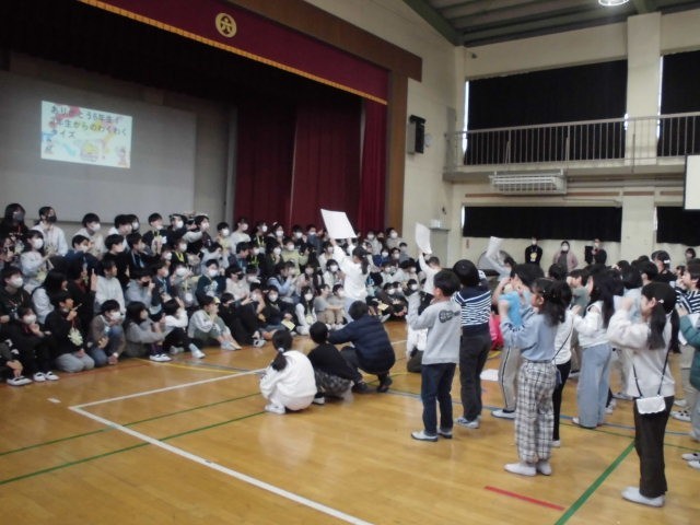 2年生は、体育館入り口のろっくり君とタッキーの絵を作成したほか、「6年生アンケートクイズ」3択問題が出題されました。①一番の思い出は?②特技は?③6年生が1年生の頃の人気のゲーム④6年生が1年生の頃の人気の映画⑤全校遠足の日⑥B時間の20分休みを質問していました。①の答えはウインタースクールだそうです。最後は、「6年生の皆さん、だ~い好き!」と言って、6年生の笑顔を引き出していました。