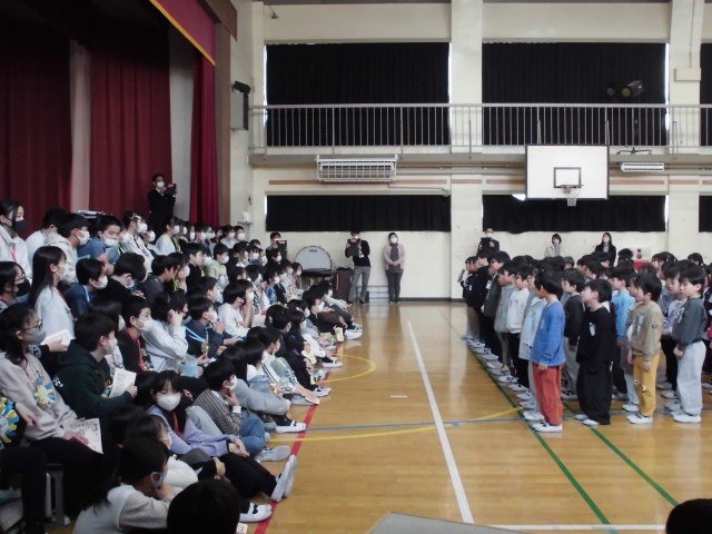 6年生からは、お礼として各学年へのメッセージを届けられ、最後に卒業式の合唱「最後のチャイム」を披露してくれました。6年生らしい、透明感と厚みのある合唱でした。