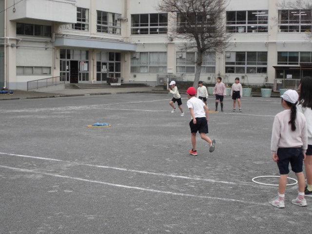 2月26日(木)2校時の校庭の様子です。今日は4年生が体育の授業を行っていました。チームで協力しながら、相手陣地にボールを送っていくゲームです。周りの様子を見て走者に声をかける等の作戦を取りながら、ボールを届けに短い距離を全力で走っていました。