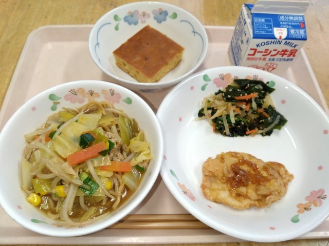 今日は、リクエストの中に「みそラーメン」と「ケーキ」があったため「野菜たっぷりみそラーメン」と「馬拉糕(マーラーカオ)」を提供しました。マーラーカオはマレーシアから中国に伝わった蒸しケーキだそうで、中国語で「馬拉(マーラー)」はマレーシアを意味し、「糕(カオ)」はケーキという意味だそうです。給食風にアレンジし、ケーキのように焼いて提供しました。昨日から楽しみにしている子が多くいましたが、今日も担任の先生方に「先生、今日ラーメンなんだよ!」と教えてくれる子がいたそうです。給食巡回中も、子どもたちから「ラーメンのおかわりありますか!?」や「油淋鶏のおかわりもっと欲しいです!」などの声も多く、みんなよく食べてくれていました。今月はリクエストの献立や子どもたちが好きな献立を多く入れているので、毎日を楽しみにしてもらいながら、たくさん食べてもらいたいと給食室一同思っています。