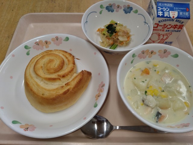 今日は、カナダの料理として、カナダの特産品である「メープルシロップ」と「サーモン」を使った献立にしました。メープルシロップは、カエデの樹木からとれる天然の甘味料で、カナダではカエデの葉が国旗に描かれるほどに親しまれている食材です。また、カナダのサーモンは脂ののりが良いことで有名で、カナダではサーモンを使った料理もたくさんあるといわれています。今日はこの2つの食材を使って「メープルシュガーパン」と「サーモンのクリーム煮」を提供しました。今年度最後の手作りパンということで、パンのおかわりのためのじゃんけん大会が多くのクラスで開催されていました。