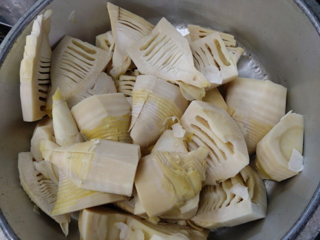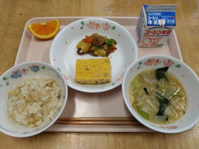 今日の給食は「たけのこごはん」です。今が旬の「たけのこ」を味わってもらうために、八百屋さんに「生のたけのこ」を注文して給食室で調理を行いました。給食室の前には、剥がした「たけのこの皮」を掲示し、興味を持った子どもたちが触ったり、匂いを嗅いだりできるようにしました。また、巡回時にはたけのこが得意ではない子もチャレンジして食べている姿が見られました。