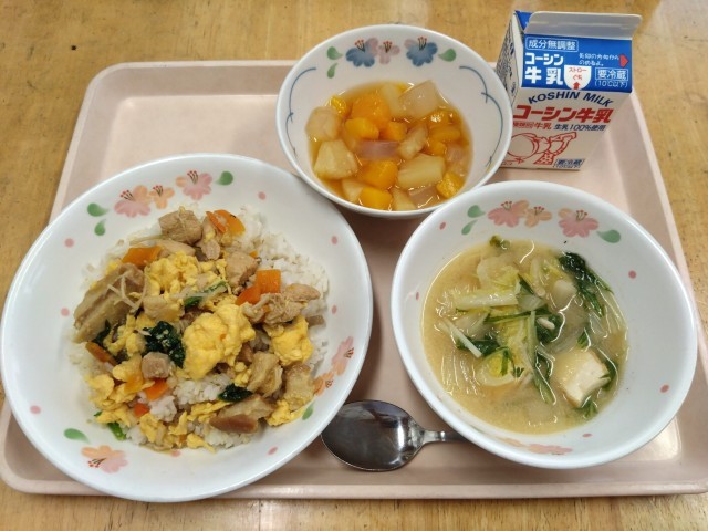 今日の「てりたま鶏丼」には「車麩」というお麩がはいっていました。クラスの巡回中におかわりをする子どもに、どんぶりのお麩が食べられたか聞くと「食べたよ、味が染みっていておいしかった!」という言葉をもらいました。お麩のことは知っている子どもたちも今日、使用したお麩が「車麩というドーナッツ型のお麩」だということを伝えると「知らなかった!」と驚いていました。てりたま鶏丼は人気だったため、残菜が少なかったのですが、汁物が多く残っていたので次回以降、食べてもらえるようにしていこうと思います。