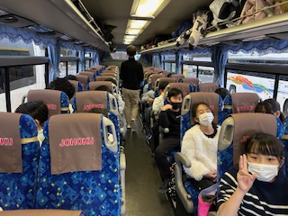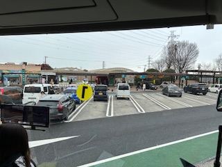 高速道路はとても空いているので、予定通り進んでいます。最初の休憩所の三芳パーキングエリアに到着しました。車中はどのバスもバスレクで盛り上がっています。