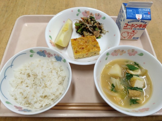 ごはん牛乳五目たまご焼き小松菜とツナの磯和えじゃがいもと厚揚げのみそ汁皮つきりん...