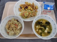 本日の献立・こぎつねごはん 鶏肉、油揚げ、にんじんを甘辛く煮て、ごはんに混ぜまし...