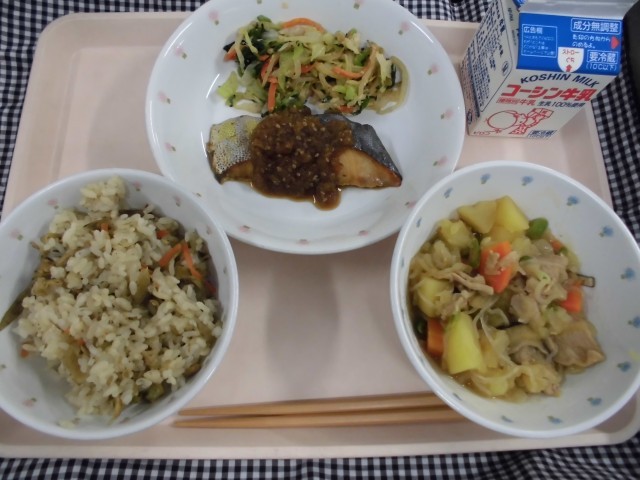 昨日の都民の日にちなんで、東京の郷土料理の深川めしにしました。美味しくできたのですが、あさりが入ったごはんは、苦手な子もいました。