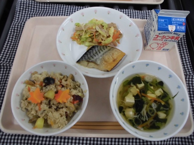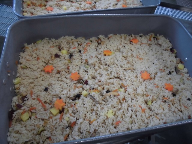 吹き寄せとは、色とりどりのもみじが風に吹かれて1か所に集まった様子を表しています。吹き寄せごはんは、秋の味覚を使ったごはんです。もみじの型で抜いたにんじんを飾りました。