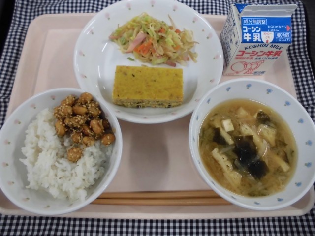 固めにゆでてでんぷんをまぶして揚げた大豆と、オーブンでローストしたちりめんじゃことごまを、しょうゆ、さとう、みりんで作ったたれであえました。