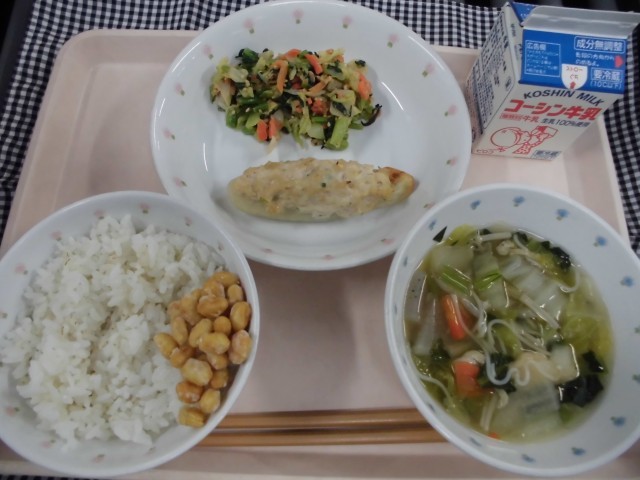 旬の野菜、豆腐、油揚げ、こんにゃく、そうめんに似た白石温麺を入れてとろみをつけた汁物です。(給食ではそうめんを使いました。)
