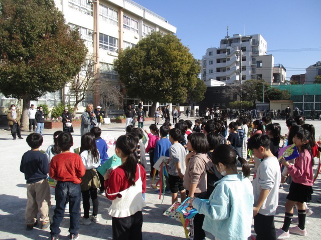 3時間目には、出来上がった和凧を、晴天のなか校庭で元気に揚げることができました。