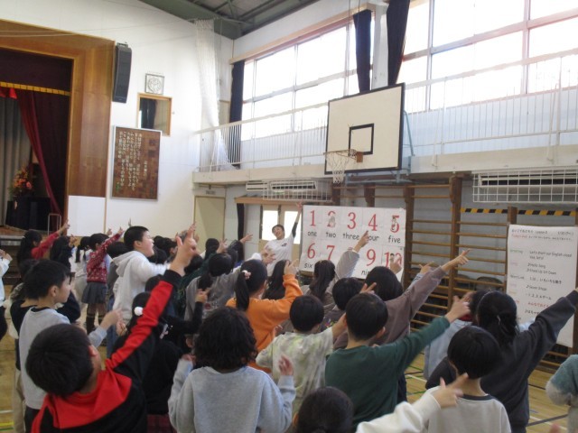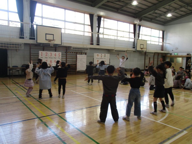 2年生は、体育館で体を使ってダンスをしながら外国語に親しみました。
