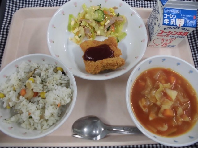 コーン、にんじん、玉ねぎ、エリンギ、ウインナー、パセリが入ったごはんです。