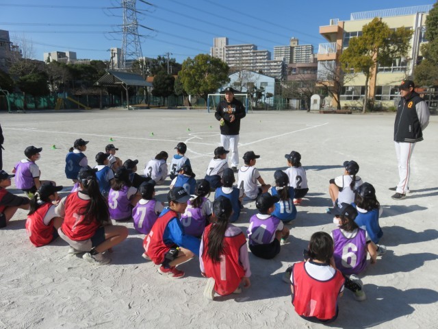 3年生は2月4日にジャイアンツの方々を招いて投げ方教室を行いました。