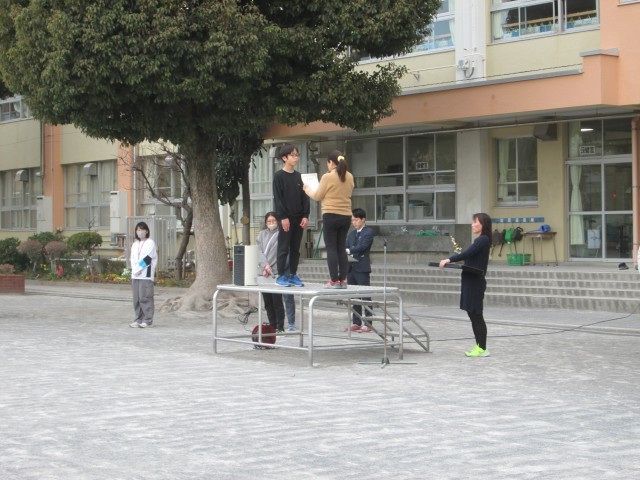 今日の全校朝会では、書初め大会、音楽コンクールの入賞者の表彰式が行われました。