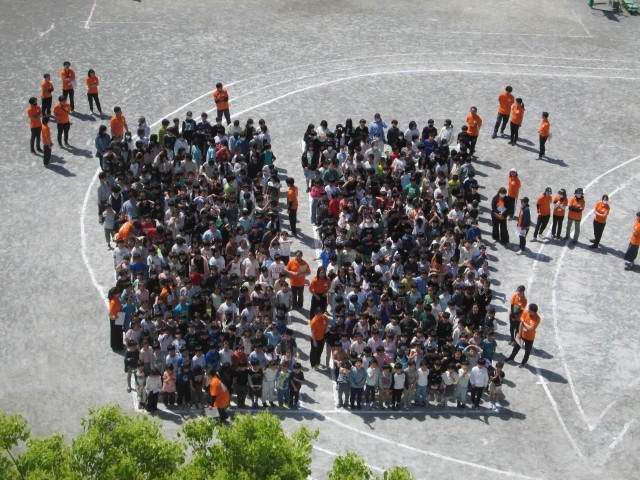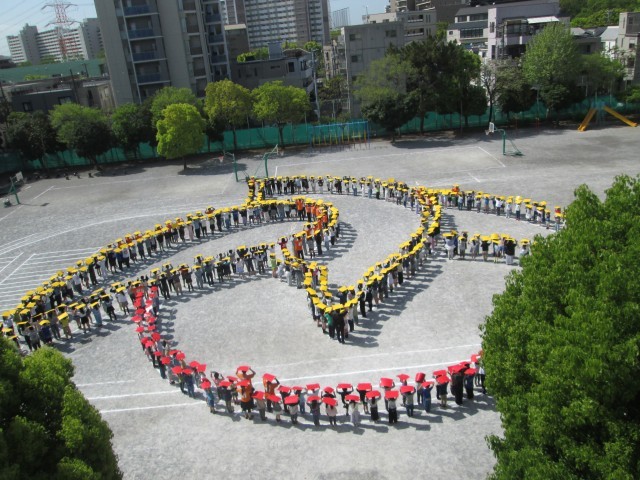 50周年記念の行事の一つ、航空写真撮影が行われました。全校のみんなで、赤と黄の色画用紙を頭の上にのせて、ドローンで写真を撮りました。どんな仕上がりかとっても楽しみですね。