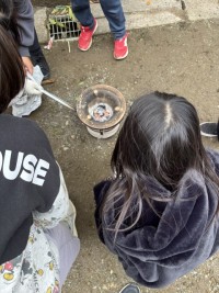 3年生は七輪を使った火起こし体験をしました。みかんの皮、新聞紙、麻ひも、牛乳パッ...