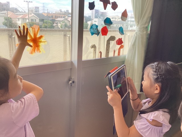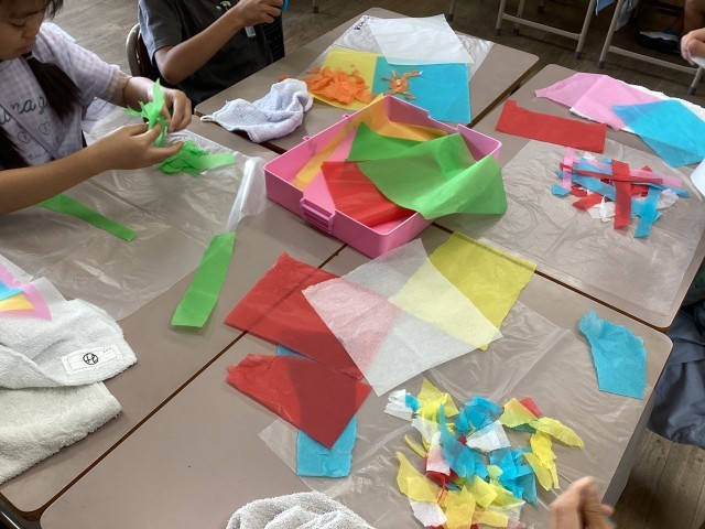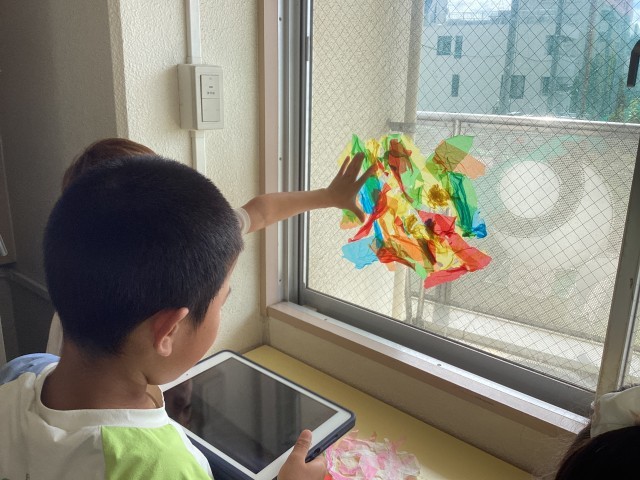 お花紙の色や形、並べ方を工夫して重ねていき、洗濯糊を使ってくっつけました。乾いてできた飾りを光に透かしてみました。