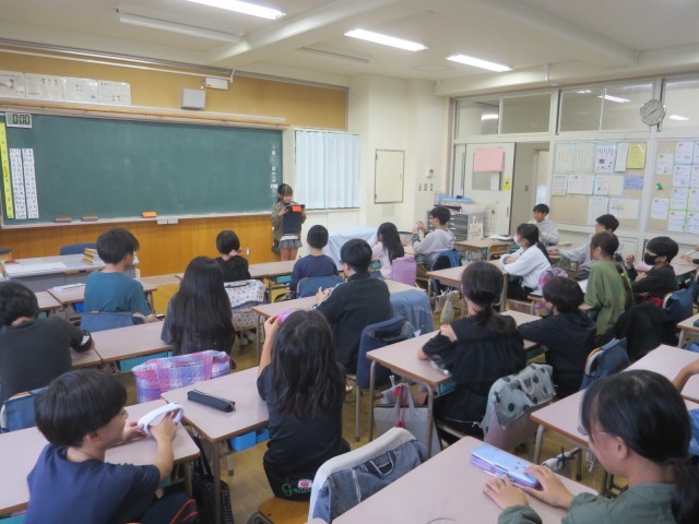 10月31日(金)5時間目の学級活動の授業において、「ハロウィーンパーティー」を行いました。レク係が中心となって、行いたい遊びの募集やルールの検討など、学級のみんなが楽しめるように考えて準備を行いました。外では「ゾンビ鬼ごっこ」、中では「お化け屋敷」を行いました。鬼役から一生懸命走って逃げたり、ミッションをクリアしようと協力したり、難問漢字の読み方に悩んだりしました。笑顔溢れる時間を過ごすことができて良かったです!!