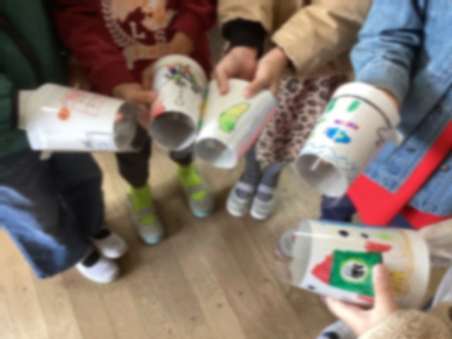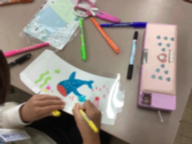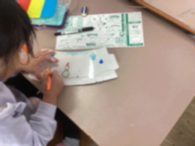 絵を描いたコップに透明なシートを重ねて回すと絵が変化する仕組みから、作品を作りました。コップの動きによる変化を使って、工夫して絵を描いていました。