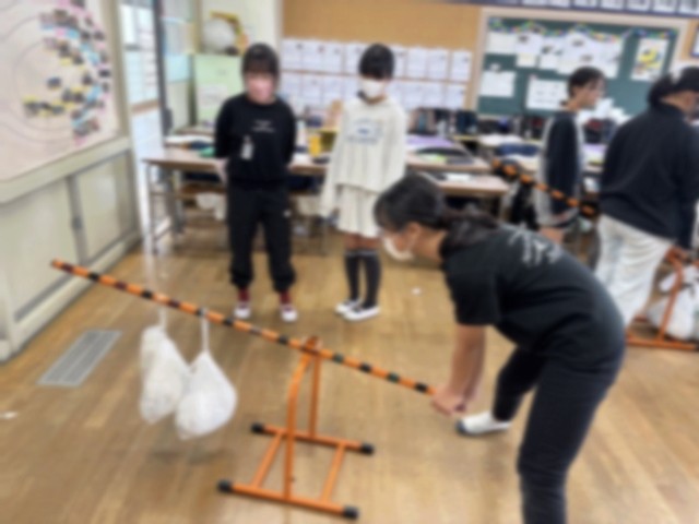 てこの規則性について、体験しながら学んでいます。力を加えたり作用したりする点があることや、点の位置を変えると重さの手応えが変化することを実験から考察しました。
