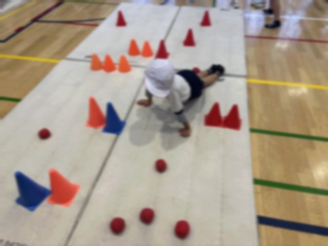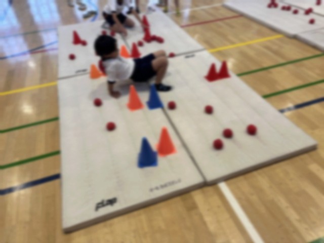 今回は、マットの上に障害物を置き、これまでに身に付けた動きをいかして進む運動に挑戦しました。中には、より難しい動きに進んで挑戦したり、障害物の置き方を工夫して難易度を高めたりする子たちの姿も見られました。