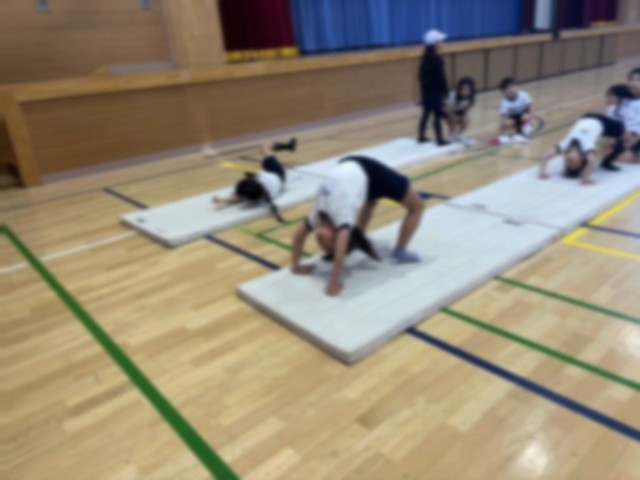 アリーナ体育では、「マットを使った運動あそび」に取り組んでいます。様々な動物の動きを真似しながら、跳んだり進んだりしました。