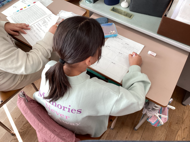 始めに振り返りカードを記入しました。9月に立てた目標と照らし合わせて、どうだったのかを考えていました。