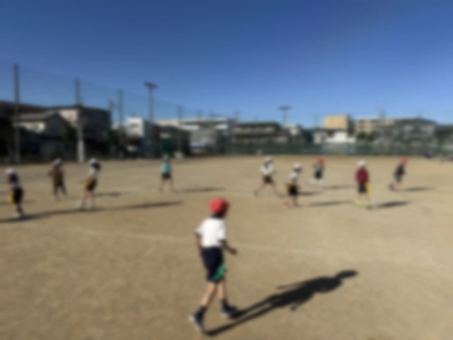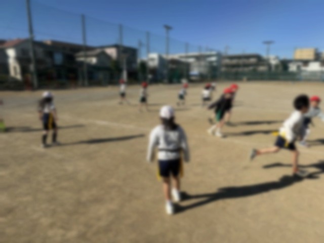 タグ鬼を行いました。腰にベルトを巻き、タグを付けて鬼に取られないように逃げました。
