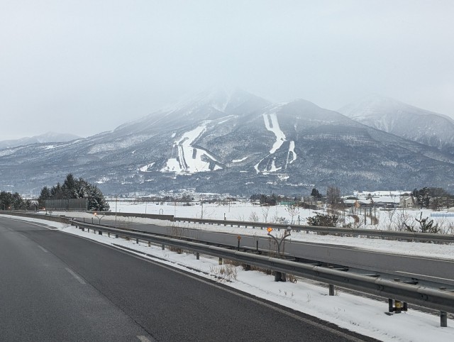 周囲はすっかり雪景色で、少し雪も舞っています。前方には明日スキーをするスキー場も見えていて「早く雪を触りたい。」と子供たちの期待も高まっています。