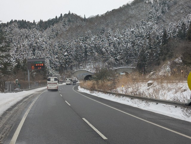 道の駅猪苗代にてタイヤにチェーンを巻いていてまもなく宿舎に到着します 。