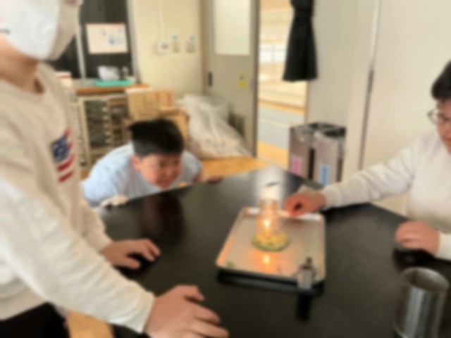 集気びんの中で、ろうそくに火をつけ、空気の動きを観察しました。空気の入り口と出口がないと、ろうそくの火が消えてしまうことに気付きました。空気の入れ替わりがものを燃やすには必要であると結論をまとめました。